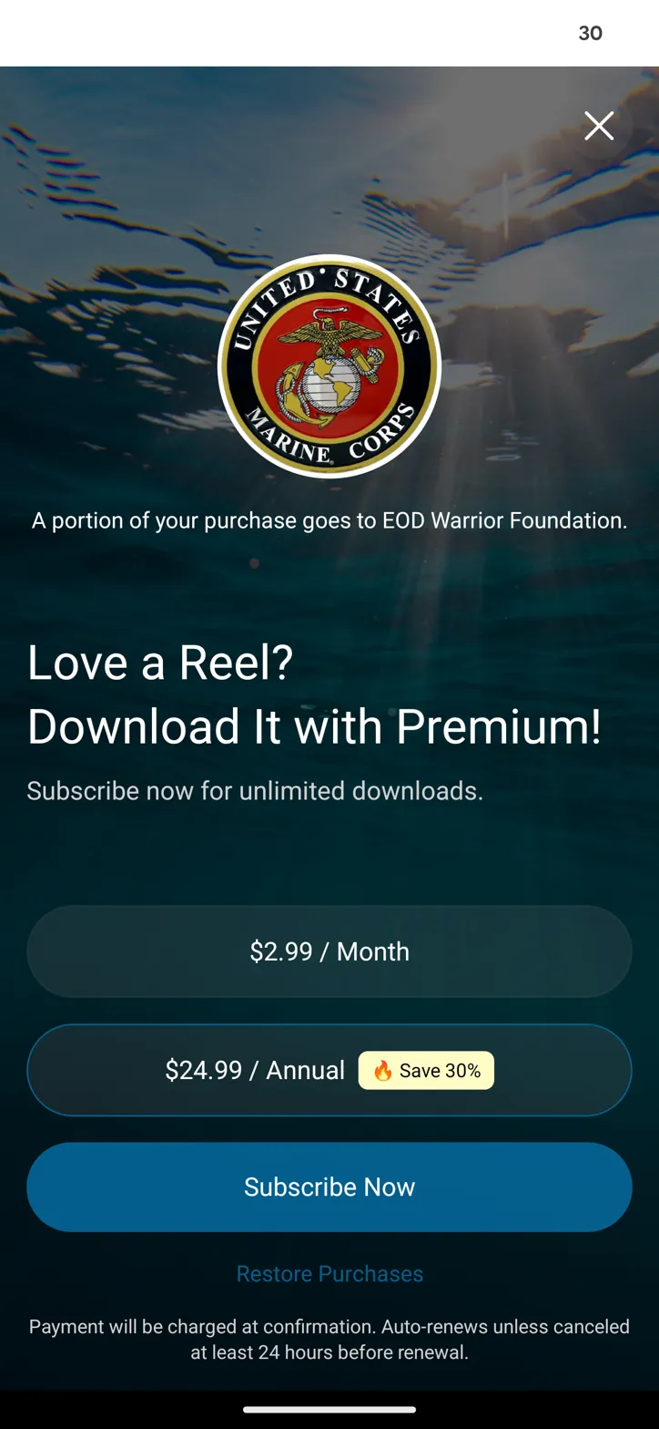 Subscribe for just $2.99/month or save 30% with our annual plan at $24.99/year for unlimited downloads of all reel sounds.